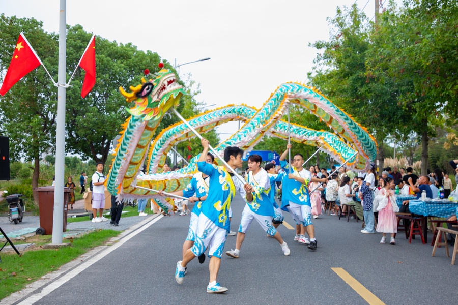 美食之外,丰富的文化表演为“水飨宴”注入别样活力。开席后,“大地丰收”大鼓与“龙游长堰”舞龙相继登场,随后的乡村时装秀将气氛推向高潮,模特身着融合漕泾本土元素的服饰,演绎乡村与时尚的碰撞。